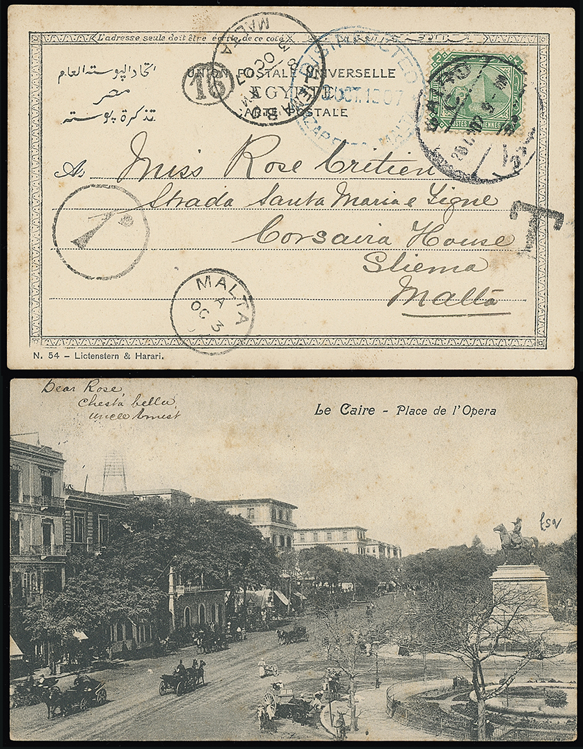 323 c, entire, etc. imageMalta: Disinfected Mail: 1907 (Sept. 28) picture postcard to Sliema franked Egypt 5m. with serif bold “T” and circular “1D” postage due mark and “DISINFECTED/LAZARETTO-MALTA” c.d.s. in blue and Malta arrival c.d.s. arrival datestamp. Ex Eastgate. Photo. (Image1)