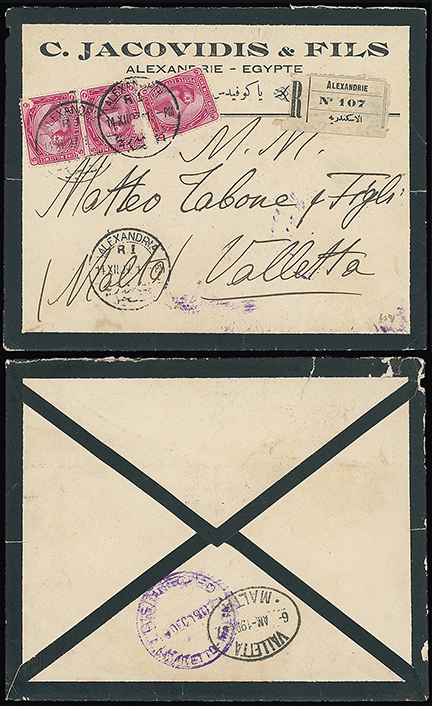 324 c, entire, etc. imageMalta: Disinfected Mail: 1907 (Dec. 14) mourning cover to Valletta franked Egypt 5m. (3, one defective) tied by Alexandria c.d.s. with printed Alexandria registration label and with “DISINFECTED/LAZARETTO-MALTA” c.d.s. in purple and Valletta oval arrival c.d.s. on the reverse. Photo. (Image1)