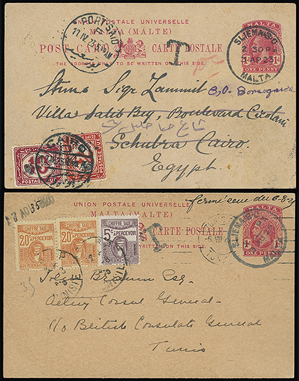 378 c, entire, etc. imageMalta: Postage Due: Outward Mail: 1923 (Apr. 3) and 1925 (Aug. 3) K.G.V 1d. postcards to Cairo or Tunis with Sliema c.d.s. with serif “T” marks and 2p. and 10m. or 5c. and 20c. pair postage dues tied by Cairo or Tunis c.d.s. respectively, fine pair. (2 items) Photo. (Image1)