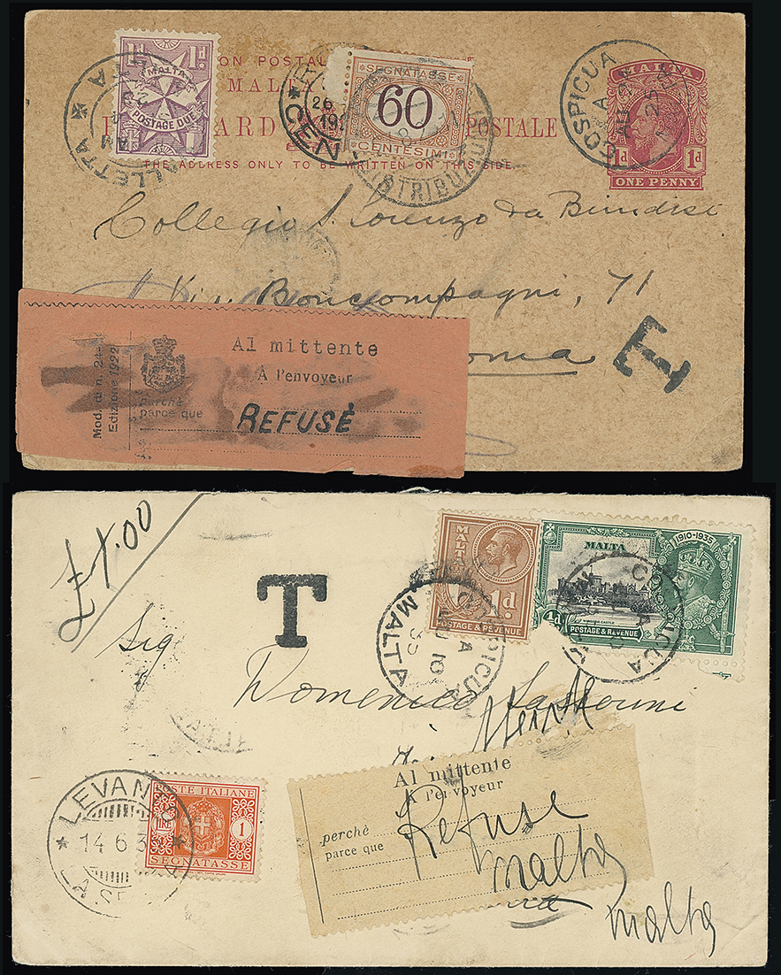 379 c, entire, etc. imageMalta: Postage Due: Outward Mail: 1925 K.G.V 1d. postcard to Rome with serif “T” mark, 60c. Italian postage due affixed, returned and with Malta 1d. postage due alongside tied by Valletta c.d.s. and 1935 envelope to Genoa franked 1/2d. and 1d. with serif “T” mark and 1l. postage due, both with official labels applied and manuscript endorsed “Refuse”. (Image1)