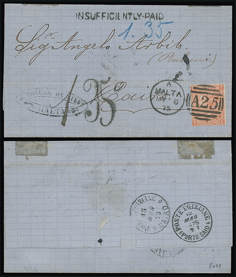367 c, entire, etc. imageMalta: Postage Due: Outward Mail: 1873 (May 8) wrapper to Cairo franked 4d. plate 14 tied by “INSUFFICIENTLY-PAID” mark, part-payment recognised and credit accordingly, manuscript “1.35” in blue crayon and with “1” and “35” marks for a 1pi.35pa charge and with Italian Post Office in Port Said and Ismalia transit datestamps on the reverse, extremely rare. Photo. (Image1)