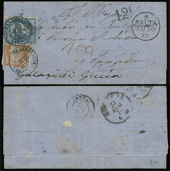 363 c, entire, etc. imageMalta: Postage Due: Outward Mail: 1870 (Aug. 30) unpaid entire letter to Galaxidi, Greece with “MALTA” c.d.s., “121/2” (cents) accountancy mark and 20l. and 30l. Greek stamps tied by Greek c.d.s. at left and the reverse with Syracuse and Athens transit c.d.s. Ex Grabfield. Photo. (Image1)