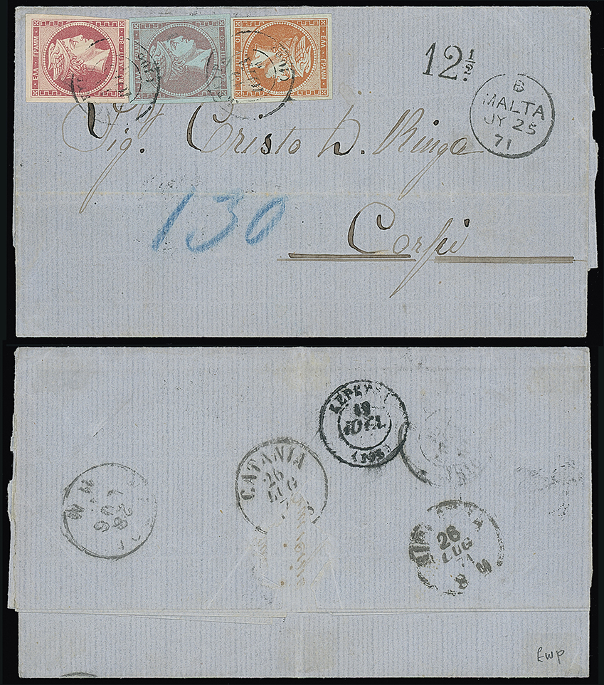365 c, entire, etc. imageMalta: Postage Due: Outward Mail: 1871 (July 25) unpaid entire letter to Corfu with “MALTA” c.d.s., “121/2” (cents) accountancy mark, rated “130” in blue crayon and with 10l., 40l. and 80l. Greek stamps tied by Corfu c.d.s. and the reverse with Syracuse and Catania transit c.d.s., very fine. Photo. (Image1)