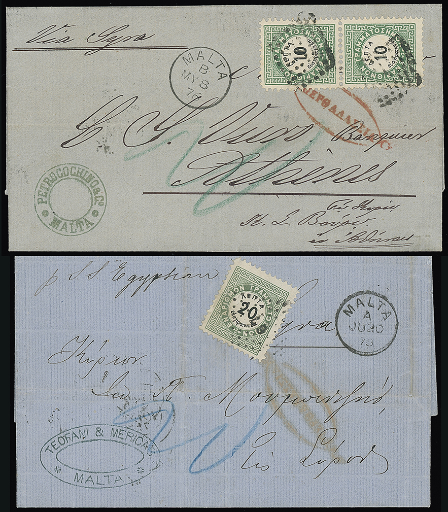 368 c, entire, etc. imageMalta: Postage Due: Outward Mail: 1875 (July 20) and 1876 (Mar. 8) unpaid entire letters to Athens or Syra with “MALTA” c.d.s. and manuscript ‘20’(lepta) charge marks and with 20l. or pair 10l. affixed and tied by dotted rhomboid cancellations, Athens and Syra arrival c.d.s. on the reverse, scarce and fine. (Image1)