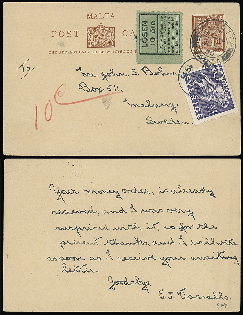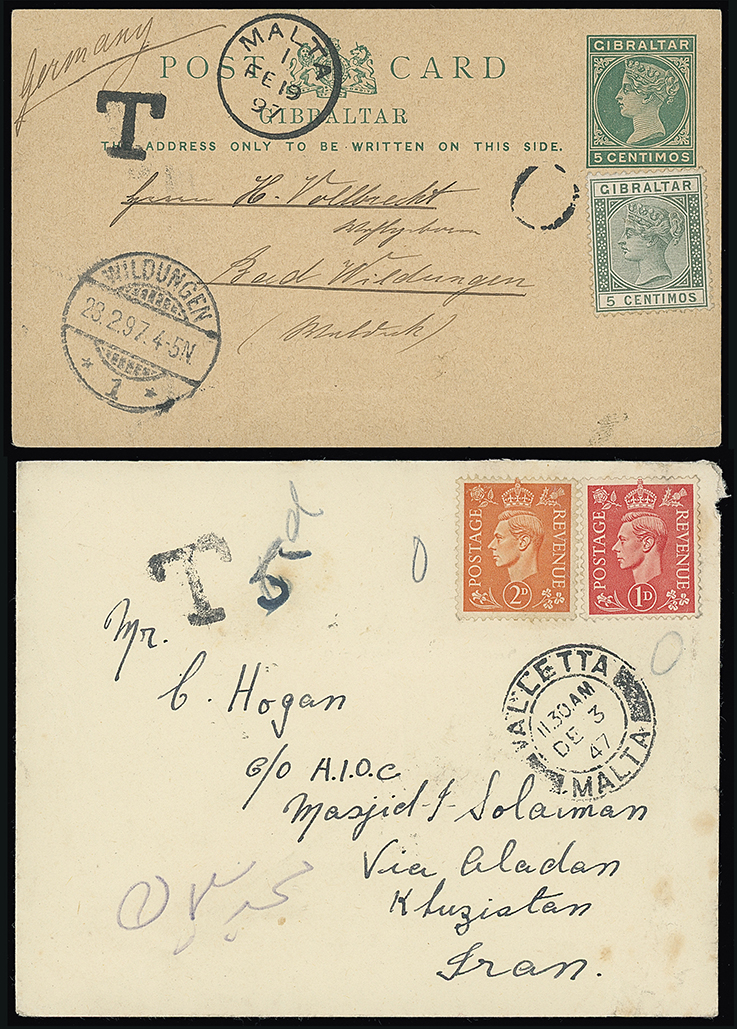 371 c, entire, etc. imageMalta: Postage Due: Outward Mail: 1897 Gibraltar 5c. postcard to Germany uprated Gibraltar 5c. with “MALTA” and serif “T” mark, indicia and stamp left uncancelled and with “O” mark alongside to indicate the franking not recognised and 1947 envelope to Iran franked G.B. K.G.VI 1d. and 2d. similarly marked “O” in manuscript alongside as an invalid franking and with Valletta c.d.s. and serif “T” mark. (Image1)