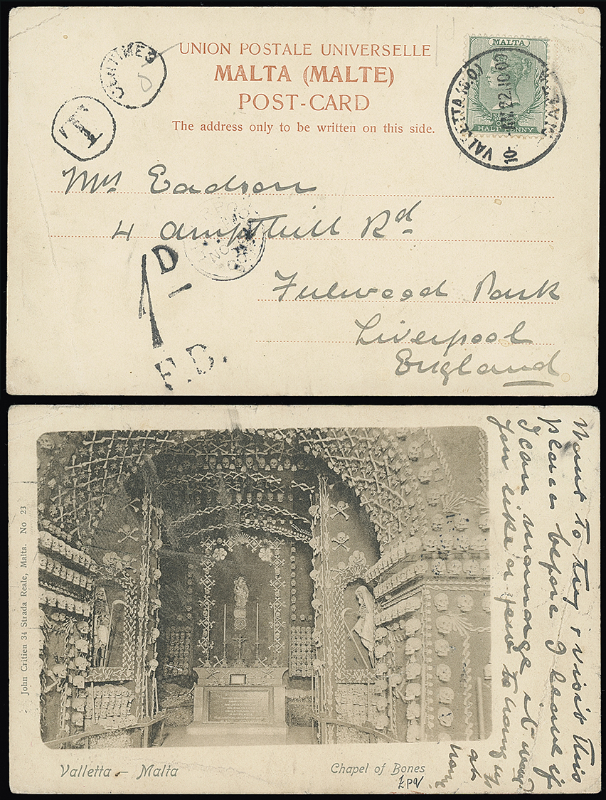 374 c, entire, etc. imageMalta: Postage Due: Outward Mail: 1900 (Nov. 22) picture postcard to Liverpool franked 1885 1/2d. tied by Valletta c.d.s. with circular “T/CENTIMES/ ‘5’” duplex, “1D/F.B.” and Liverpool arrival c.d.s. Ex Eastgate. Photo. (Image1)