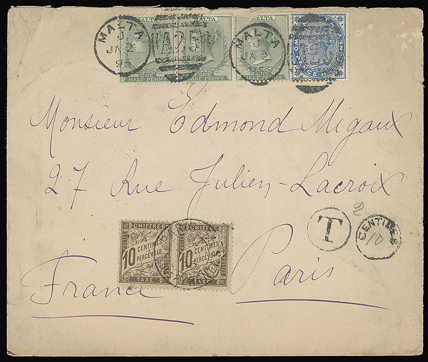 369 c, entire, etc. imageMalta: Postage Due: Outward Mail: 1895 (Jan. 2) envelope to Paris franked 1/2d. strip of three and 21/2d. tied by “A25” duplexes, underpaid 1d. and with circular serif “T/CENTIMES/’10’” duplex and pair of French 10c. postage dues tied by a Paris c.d.s. Photo. (Image1)