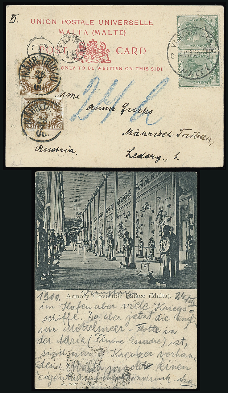 373 c, entire, etc. imageMalta: Postage Due: Outward Mail: 1900 (July 24) picture postcard to Austria franked 1/2d. pair tied by Valletta c.d.s. with serif “T/CENTIMES/15” duplex and Austraia 5kr. and 7kr. tied at left. Photo. (Image1)