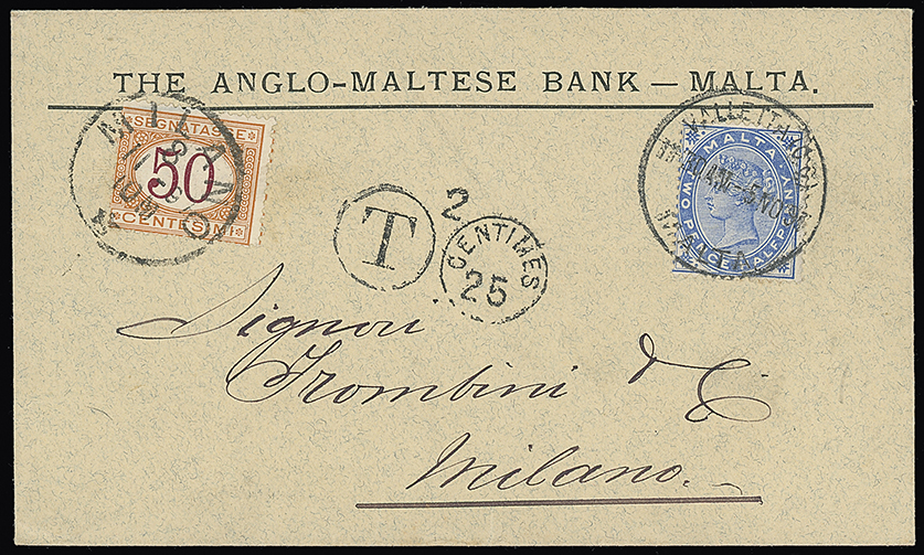 372 c, entire, etc. imageMalta: Postage Due: Outward Mail: 1897 (Nov. 5) bank envelope to Milan franked 21/2d. tied by Valletta c.d.s. with serif “T/2/CENTIMES/25” duplex and Italy 50c. postage due tied by Milan c.d.s., very fine and rare. Ex Eastgate. Photo. (Image1)
