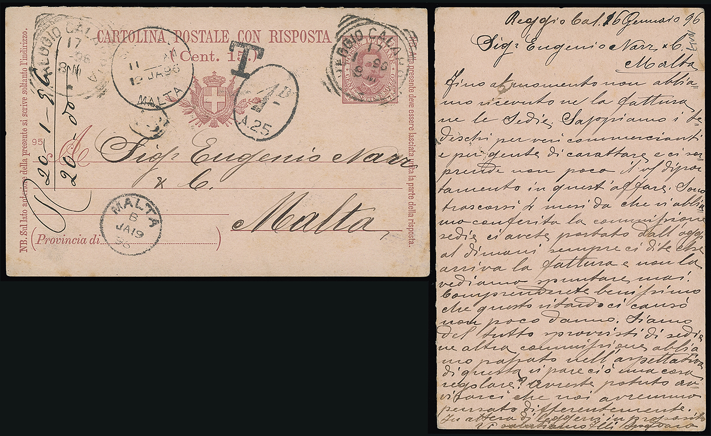 370 c, entire, etc. imageMalta: Postage Due: Outward Mail: 1896 (Jan. 17) underpaid Italy 71/2c. postcard to Malta from Reggio Calabria with Malta, Sliema, serif “T” mark and rare oval “1D/A.25” mark, mostly fine. Ex Eastgate. Photo. (Image1)