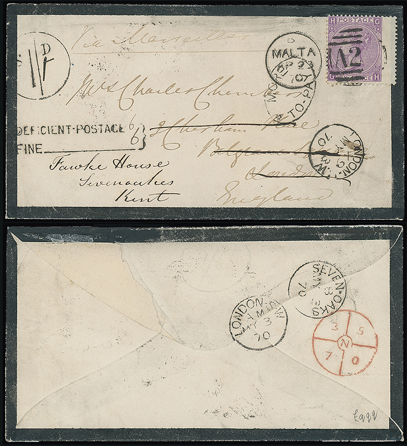 361 c, entire, etc. imageMalta: Postage Due: Outward Mail: 1870 (Apr. 23) mourning envelope “via Marseilles” to London franked 1868 6d. plate 8 (wing margin) tied by “A25” duplex underpaid by a further 6d. with circular “S1/D-” - the dash altered to ‘1’ upon arrival to account for redirection to Kent and unusual thus also “DEFICIENT POSTAGE ‘6’/FINE ‘6’}” and oval “MORE/TO-PAY” marks, very rare combination of three tax marks. Ex Geldart and Turnbull. Photo. (Image1)
