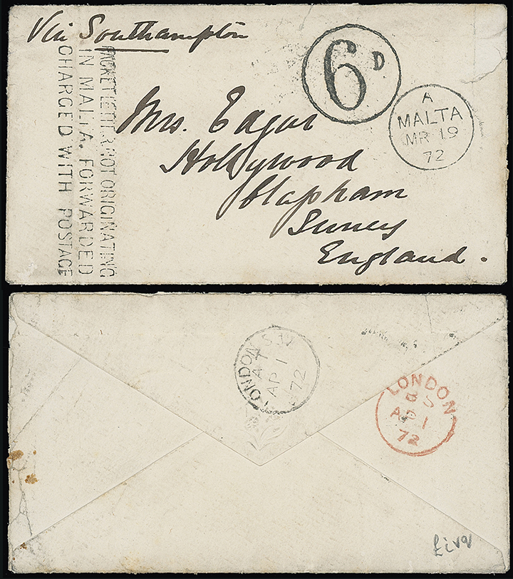 366 c, entire, etc. imageMalta: Postage Due: Outward Mail: 1872 (Mar. 19) unpaid envelope “via Southampton” to London from abroad or possibly posted on board a ship and handed in at Malta with a “MALTA” c.d.s., very rare “PACKET LETTER NOT ORIGINATING/IN MALTA. FORWARDED/CHARGED WITH POSTAGE” mark and a circular “6D” charge mark applied and with London and London SW c.d.s’s on the reverse. Important exhibition item, mostly fine. Photo. (Image1)
