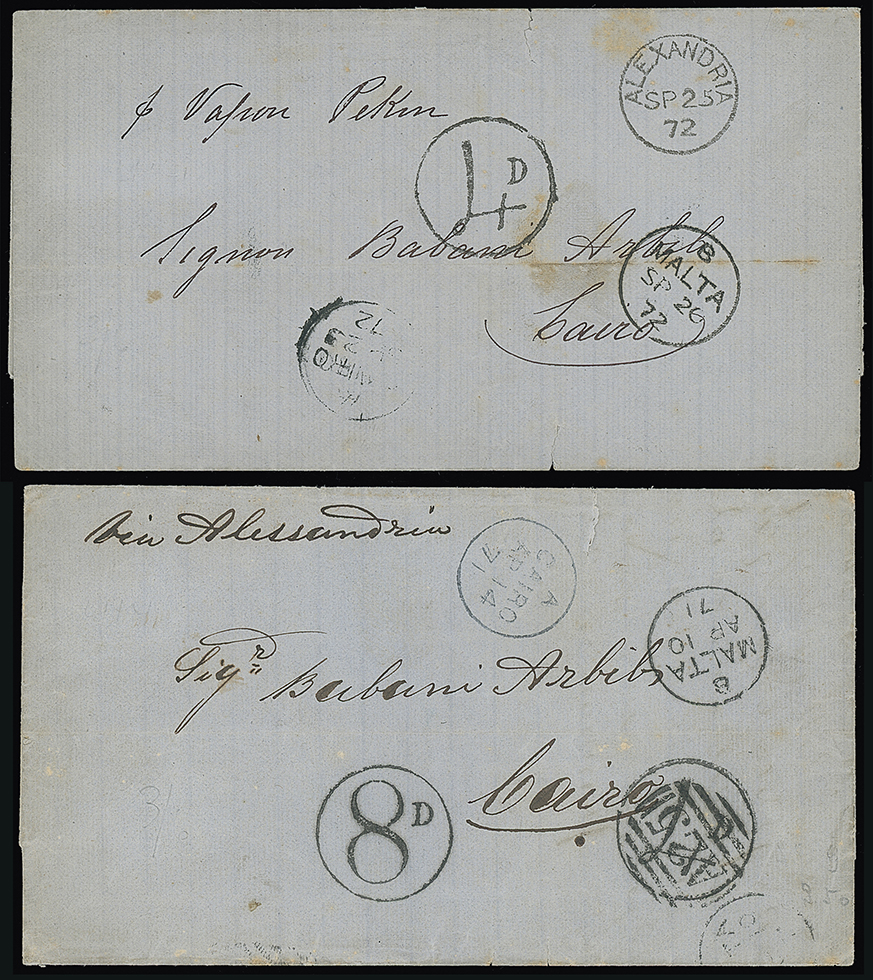 364 c, entire, etc. imageMalta: Postage Due: Outward Mail: 1871 (Apr. 10) and 1872 (Sept. 26) single and double weight wrappers to the same addressee in Cairo, sent entirely unpaid and with circular “4D” and “8D” charges marks, the latter struck with both these charge marks and with the incorrect mark overstruck with an “A25” duplex and unusual thus, each with Malta, Alexandria and Cairo c.d.s’s. (2 items) (Image1)