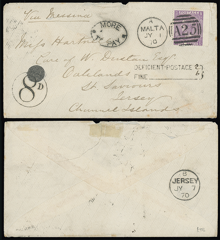 362 c, entire, etc. imageMalta: Postage Due: Outward Mail: 1870 (July 1) envelope (torn rear flap) to Jersey franked 1868 6d. plate 8 (wing margin) tied by “A25” duplex with “DEFICIENT POSTAGE ‘2’/FINE ‘6’}”, oval “MORE/TO-PAY” and circular “8D” marks, very rare combination of three tax marks, small ink stain and with Jersey arrival c.d.s. on the reverse. Ex Orme, Frank and Coates. Photo. (Image1)