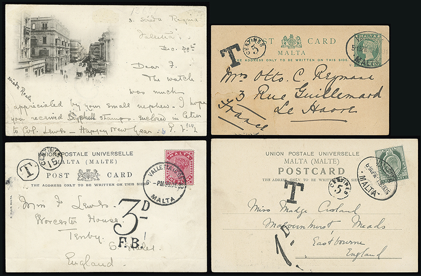 375 c, entire, etc. imageMalta: Postage Due: Outward Mail: Selection of postcards with 1901 1/2d. postcard to Le Havre and 1905 picture postcard to England franked 1/2d. with serif “T”and “CENTIMES/5” marks, the latter with an additional “1D” mark also a 1909 picture postcard to Wales franked 1d. tied by Valletta c.d.s. with circular “T/CENTIMES/15” duplex and “3D/F.B.” marks. (3 items) (Image1)