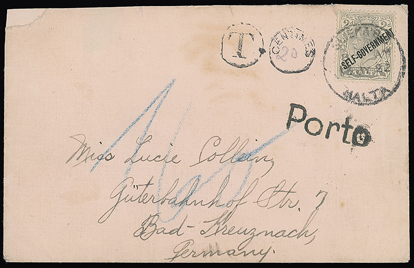 377 c, entire, etc. imageMalta: Postage Due: Outward Mail: 1922 (July 13) envelope (small repairs) to Germany franked 2d. “SELF-GOVERNMENT” tied by Sliema c.d.s. with “T”/CENTIMES/’20’” and German “Porto” marks and charged ‘160’ pfg., very scarce. Ex Eastgate. Photo. (Image1)