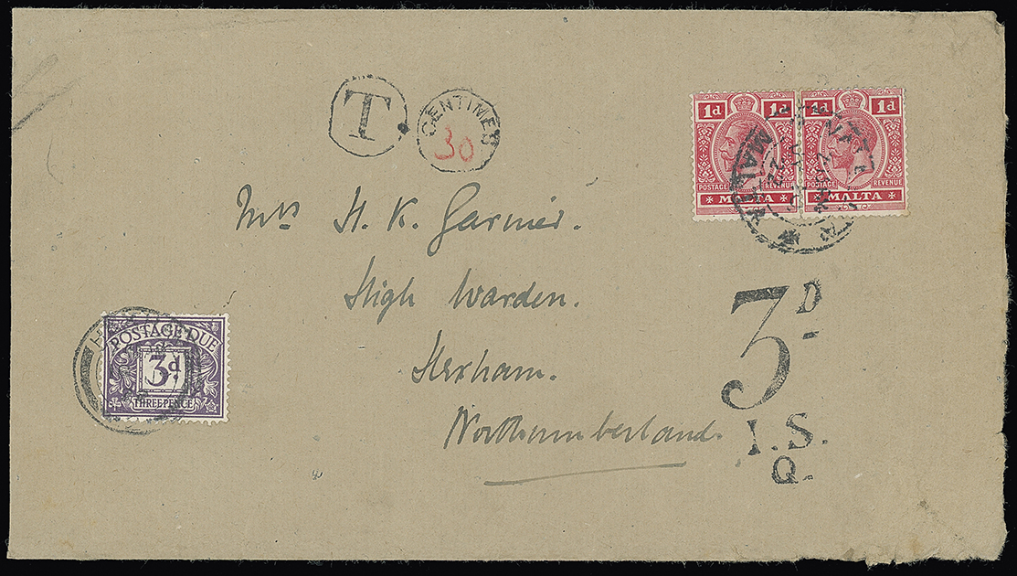 376 c, entire, etc. imageMalta: Postage Due: Outward Mail: 1922 (July 10) envelope to England franked pair K.G.V 1d. tied by Valletta c.d.s. with “T”/CENTIMES/’30’”, “3D/I.S./Q.” marks and franked G.B. 3d. postage due tied by Hexham c.d.s., very scarce. Ex Eastgate. Photo. (Image1)