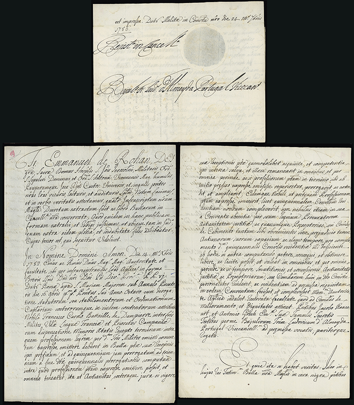 37 c, entire, etc. imageMalta: Early Letters and Documents: 1786 (Sept. 17) Grant document by Grand Master (1775-1797) Emanuel de Rohan to Father Francesco Carolo de Bataille de Dampierre granting him a further exemption from living in a convent. Signed by the Vice-Chancellor and with a large circular portrait seal of the Grand Master. Photo. (Image1)