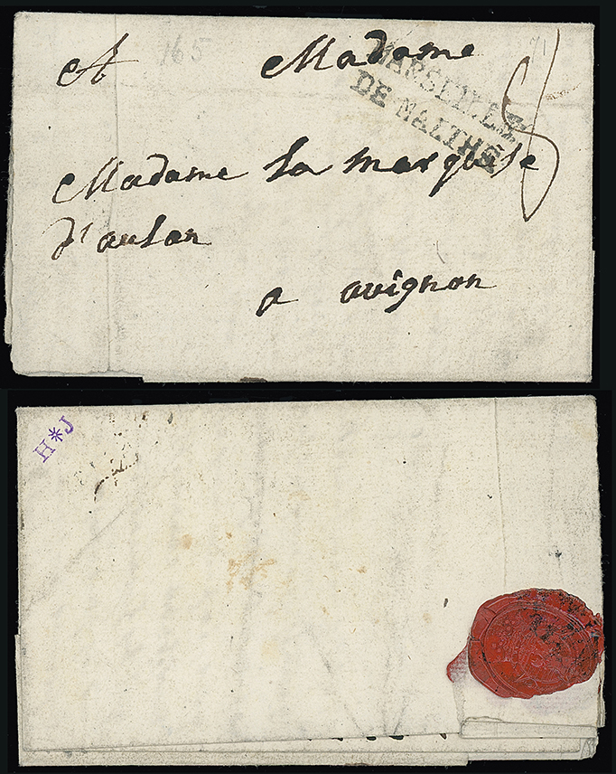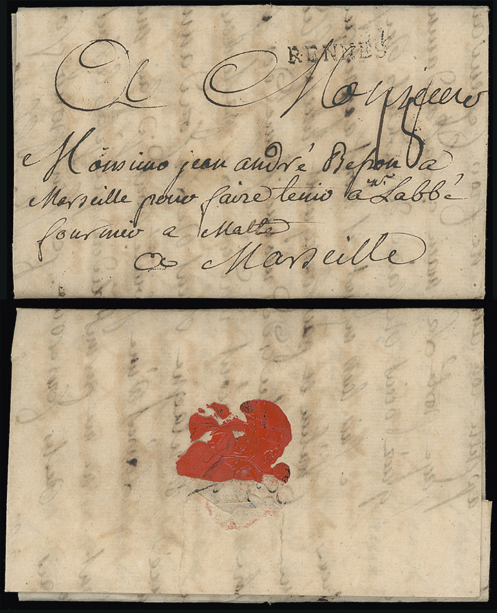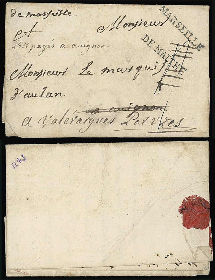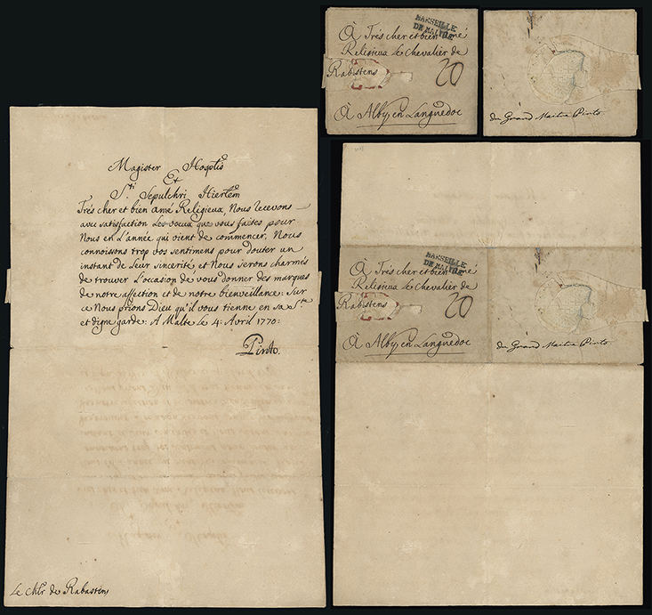 28 c, entire, etc. imageMalta: Early Letters and Documents: 1770 (Apr. 4) entire letter (toned) to Albi, France from the Grand Master (1741-73) Manuel Pinto da Fonseca with embossed seal on the reverse on a separate tongue used to fasten the reverse to the front and affixed with red wax. “MARSEILLE/DE MALTE” mark in black applied in transit at Marseille and rated “20” sols. Photo. (Image1)