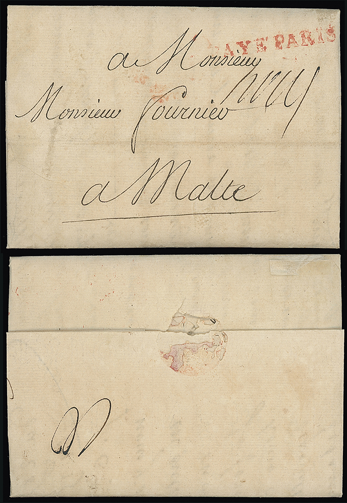 30 c, entire, etc. imageMalta: Early Letters and Documents: 1771 (Mar. 14) entire letter to Malta with straight line “PAYE PARIS” in red and rated “10” in black on the reverse fine. Photo. (Image1)