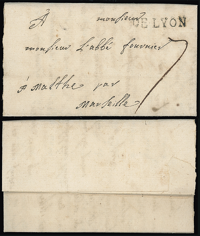 34 c, entire, etc. imageMalta: Early Letters and Documents: 1774 (June 12) entire letter to Malta with straight line “DE LYON” in red and rated “7” in black on the reverse fine. Photo. (Image1)