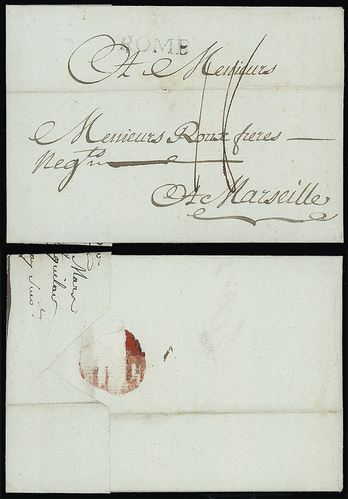 40 c, entire, etc. imageMalta: Early Letters and Documents: 1790 (Mar. 26) entire letter to Marseille from Malta sent via the French P.O. in Rome with straight line “ROME” and carried by a courier of the Order to Rome. Rated “18” decimes, mostly fine. Ex Said. Photo. (Image1)
