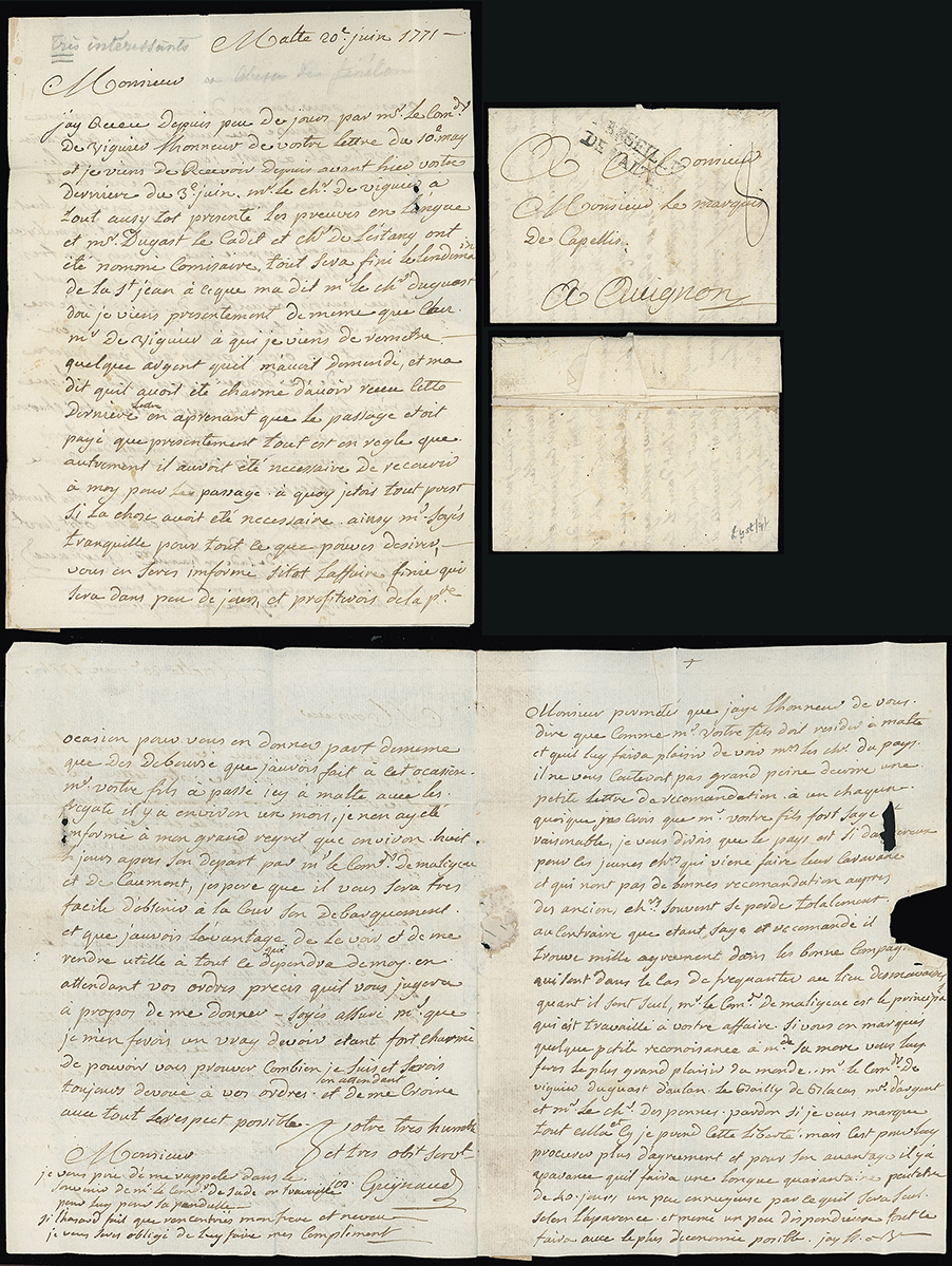 31 c, entire, etc. imageMalta: Early Letters and Documents: 1771 (June 20) entire letter to Avignon, France from a Knight with “MARSEILLE/DE MALTE” mark in black applied in transit at Marseille and rated “8” sols. The addressee, Francois de Capellis (1711-72) had a son in the Navy who the writer states had visited Malta with his frigate about a month prior. Photo. (Image1)