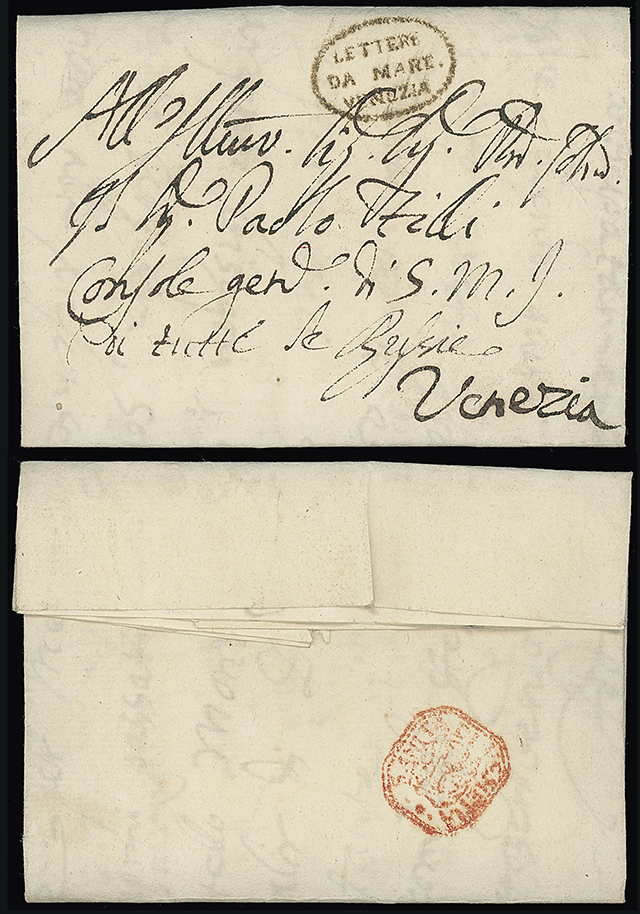 38 c, entire, etc. imageMalta: Early Letters and Documents: 1788 (Nov. 2) entire letter to the Russian Consul in Venice from Malta, apparently handcarried and with bogus oval “LETTERE/DA MARE/VENEZIA” and “SANITA DI VENEZIA” marks in red. Photo. (Image1)