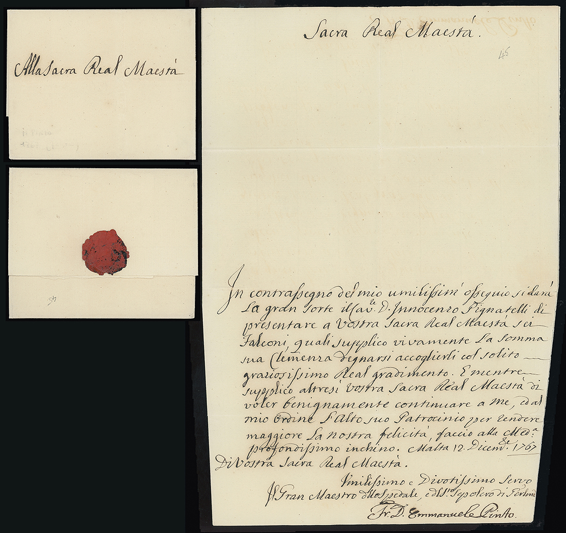 24 c, entire, etc. imageMalta: Early Letters and Documents: 1767 (Dec. 12) letter to Ferdinand, King of Naples and Sicily from Grand Master (1741-73) Manuel Pinto da Fonseca “As a sign of my most humble devotion Cavliere D.Innocenzo Pignatelli presents your Holy Royal Majesty with six falcon. Be pleased to accept this sum with your accustomed most gracious pleasure. I beg you to continue your great patronage of myself and my order.” Photo. (Image1)