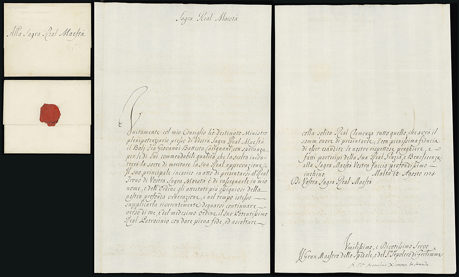 35 c, entire, etc. imageMalta: Early Letters and Documents: 1775 (Aug. 12) letter to Ferdinand, King of Naples and Sicily from Grand Master (1773-75) Francisco Ximenez de Texada “As my counsellor and plenipotentiary minister I have sent Fr. Giovanni battista Carignani hoping that his outstanding qualities will meet your approval. His main charge as he presents himself at your throne is to reassure you in my name of the humble devotion of our order and to ask you to continue your most powerful royal patronage and hear me with mercy and grant our respectful petitions.” Photo. (Image1)