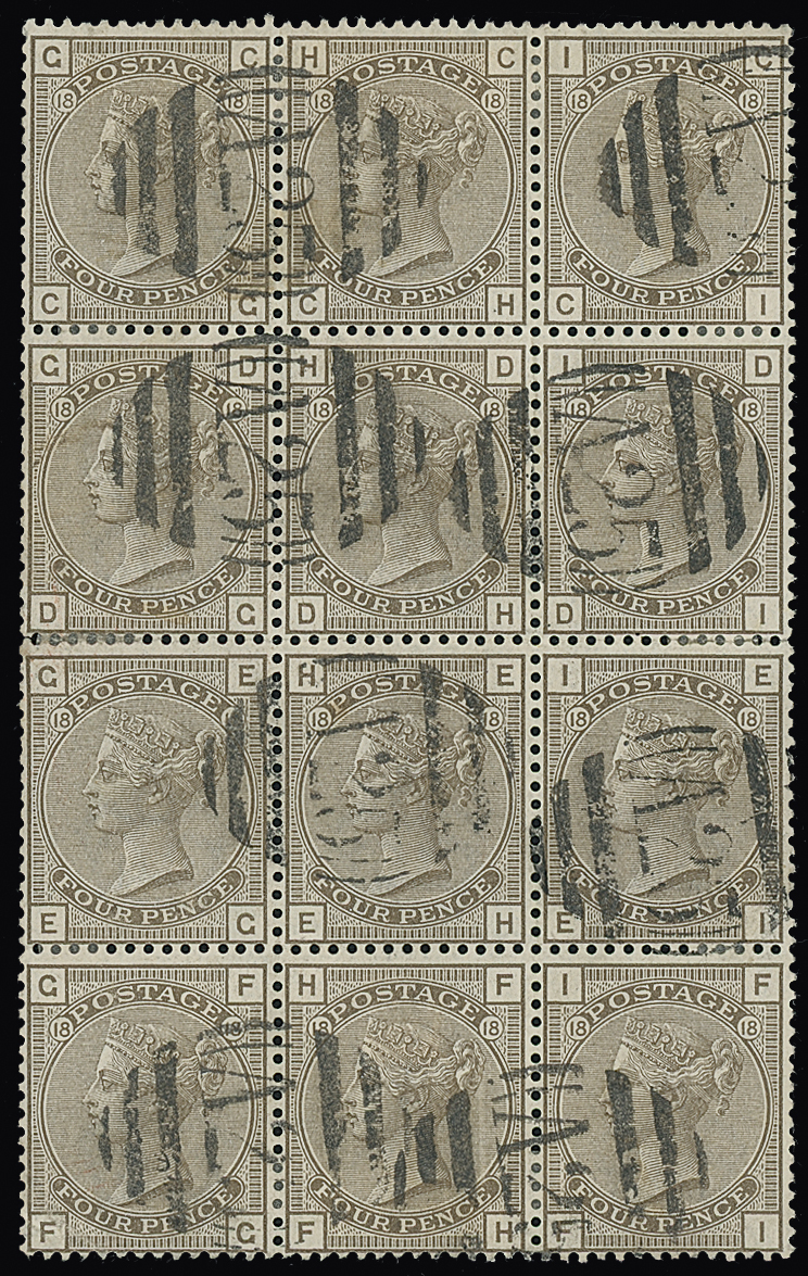 Malta: A25 Cancellations: 1880 4d. grey brown plate 18 CG-FI used block of twelve, fine. S.G. Z53. Photo.