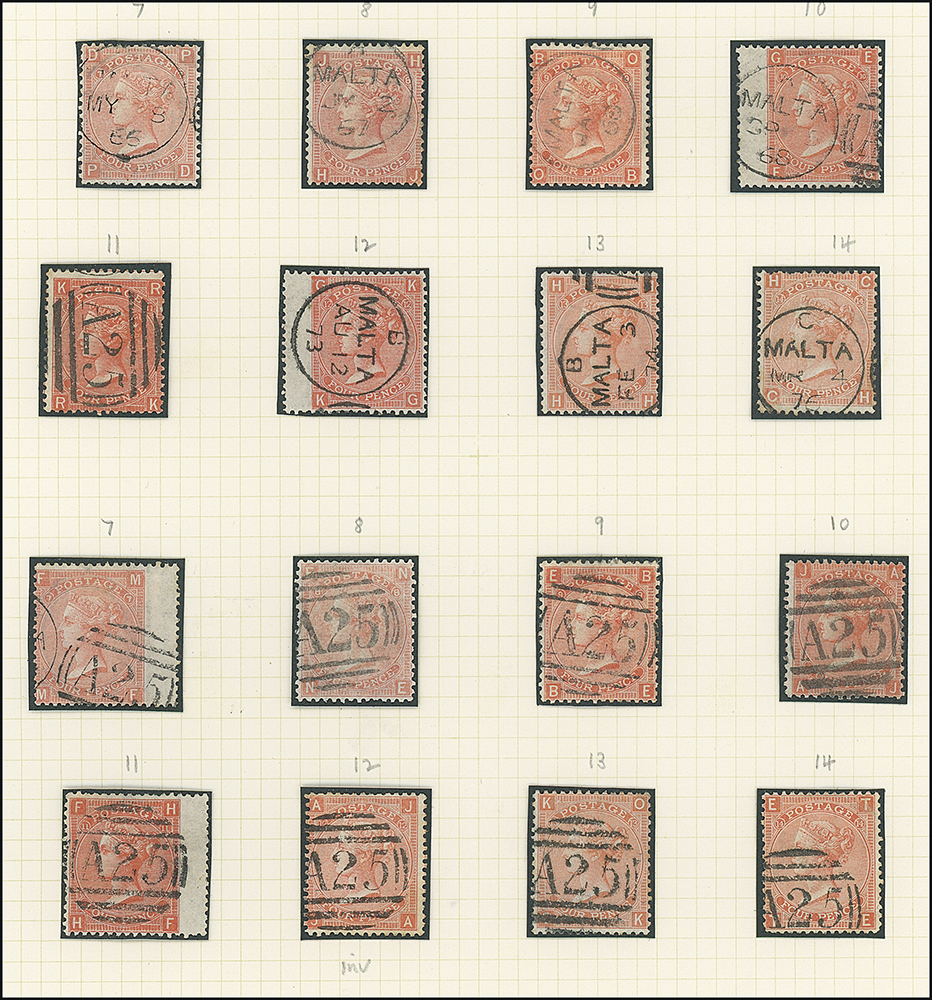 Malta: A25 Cancellations: 1865 4d. vermilion, plates 7 to 14, two of each, mainly good to fine. S.G. Z49.