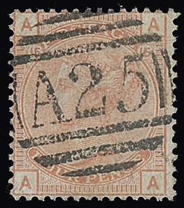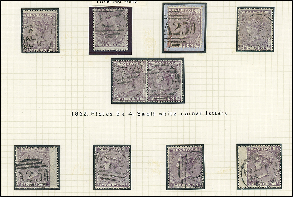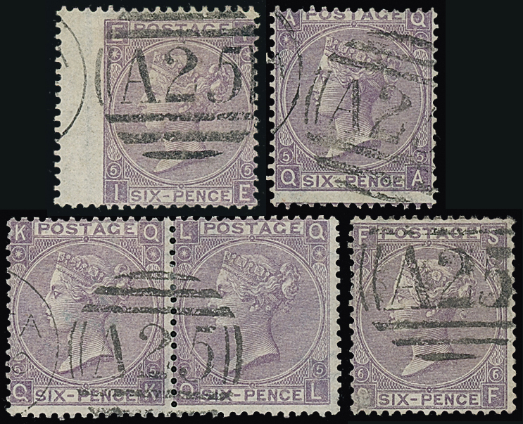 Malta: A25 Cancellations: 1865-67 6d. lilac plate 5 IE, QA QK-QL pair, plate 6 SF, fair to fine. S.G. Z58.