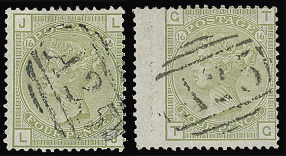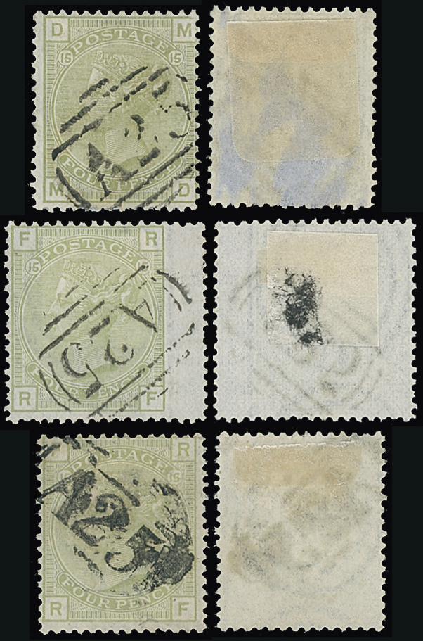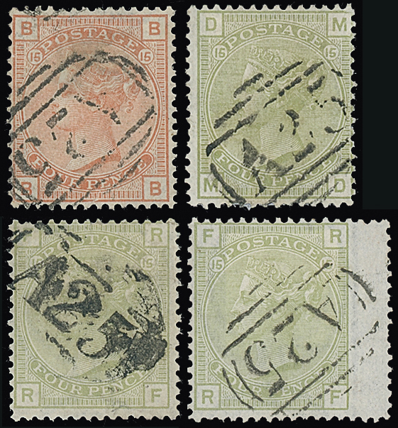 Malta: A25 Cancellations: 1877 4d. sage-green plate 15 MD and RF (2, one with reperf. wing margin), otherwise fine. S.G. Z51. Photo. (Image1)