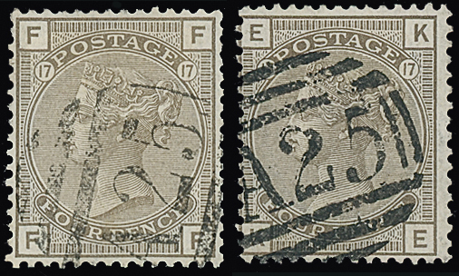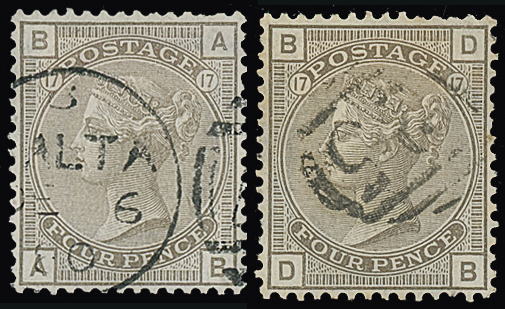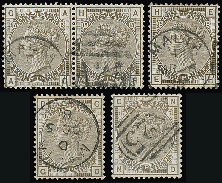 Malta: A25 Cancellations: 1880 4d. grey-brown plate 17 GD, ND, plate 18 AG-AH pair, EH, good to fine. S.G. Z53.