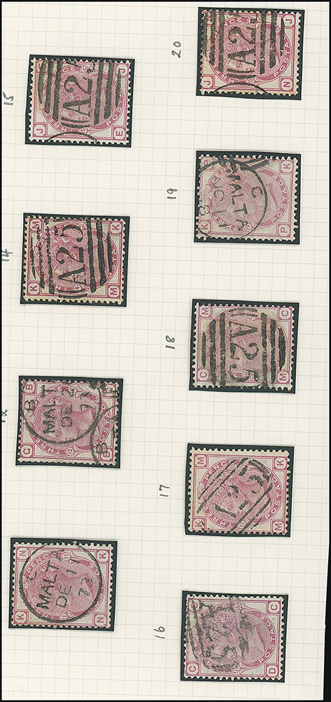 Malta: A25 Cancellations: 1873-76 3d. rose plates 11 to 20, good to fine. S.G. Z44. (Image1)
