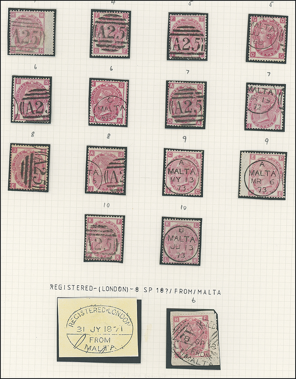 Malta: A25 Cancellations: 1867-73 3d. rose plates 4 to 10, two of each, also plate 6 on piece with extra scarce oval “REGISTERED LONDON/FROM/MALTA” datestamp. S.G. Z43. Photo. (Image1)