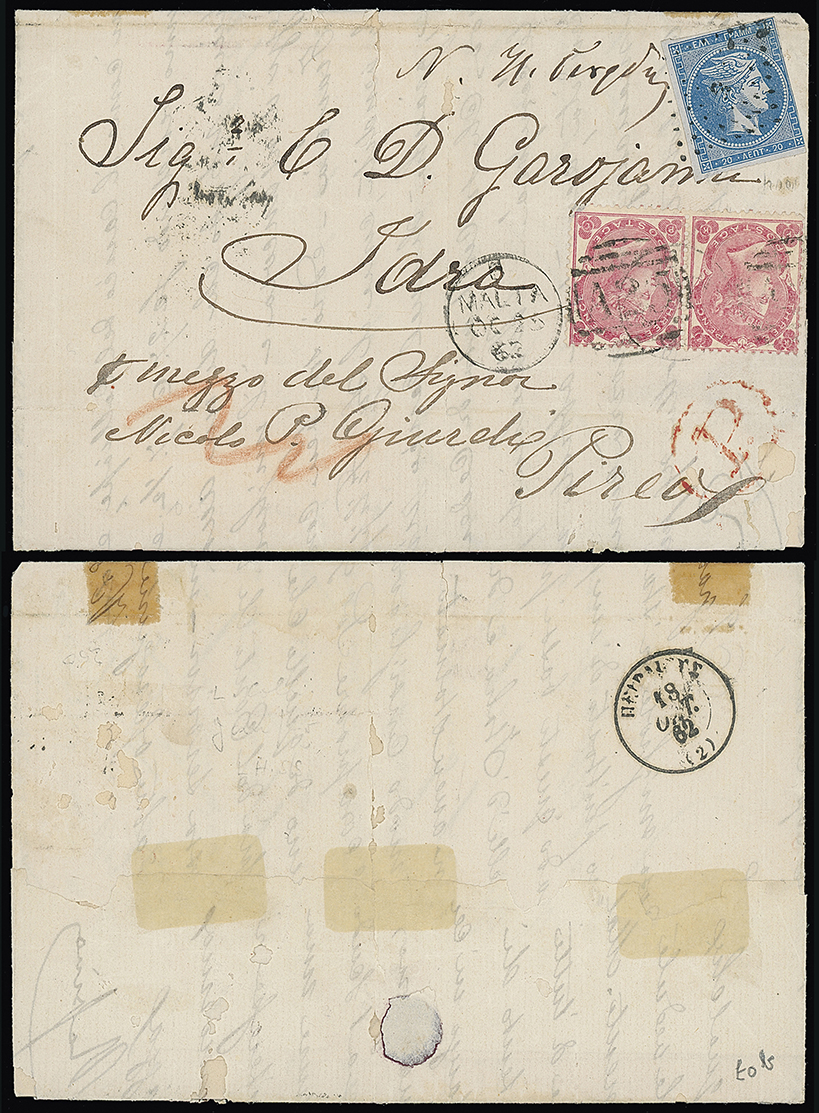 Malta: A25 Duplexes: Covers: 1862 (Oct. 25) entire letter to Piraeus franked 1862 3d. pair tied by A25 duplex, rated ‘20’ lepta due with Greece 1861 20l. affixed to top right and tied by “2” (Piraeus) lozenge