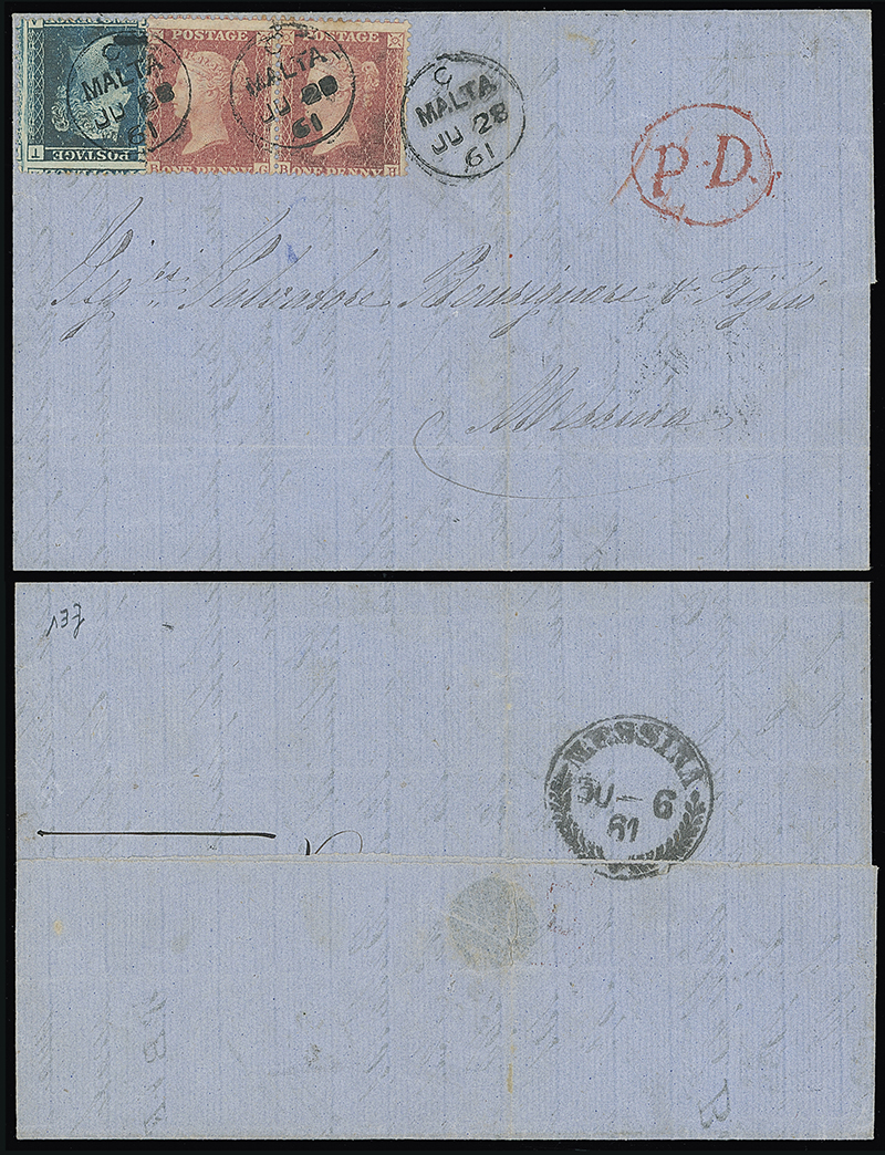 Malta: A25 Duplexes: Covers: 1861 (June 28) entire letter to Messina franked 1857 1d. pair and 2d. plate 8 tied by three strikes of the “MALTA” c.d.s. (code “C”) in lieu of the “A25” duplex and unusual, red oval