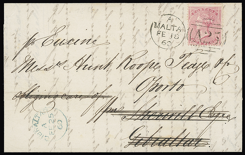 Malta: A25 Duplexes: Covers: 1860 (Feb. 18) entire letter “p Euxine” to Oporto franked 1860 4d. tied by “A25” duplex sent care of a forwarding agent in Gibraltar with transit c.d.s. at lower left and apparently