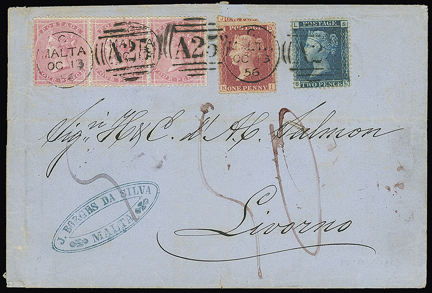 Malta: A25 Duplexes: Covers: 1859 (Oct. 13) wrapper (faults to reverse) to Livorno franked 1857 1d., 1858 2d. plate 7 and 1857 4d. strip of three tied by “A25” duplex with error “6” for “9” in year, part Messina