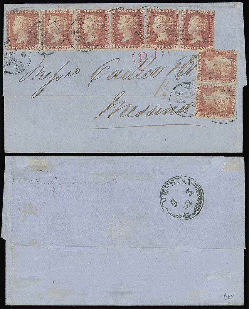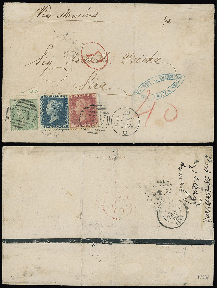 Malta: A25 Duplexes: Covers: 1862 (Feb. 26) entire letter “via Messina p French Packet” to London with unusual franked 1858 2d. plate 9 block of three and 1856 6d. pair (wing margin) tied by “A25” duplexes with
