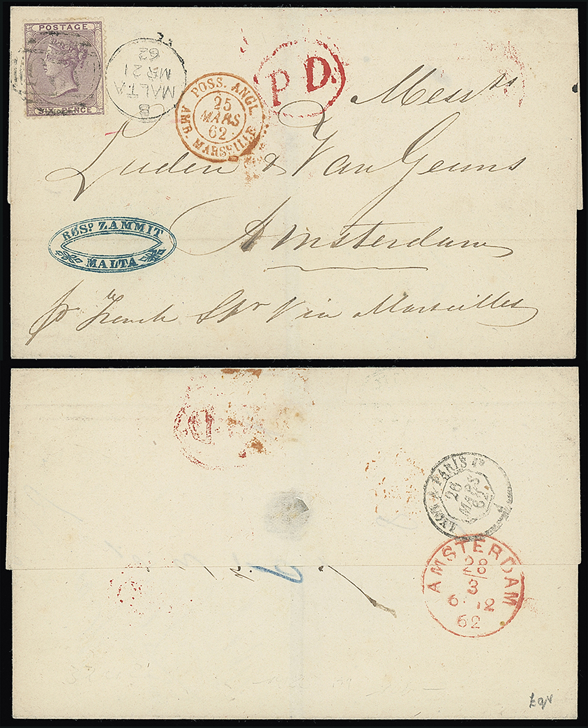 Malta: A25 Duplexes: Covers: 1862 (Mar. 21) wrapper “pr French Steamer via Marseilles” to Amsterdam franked 1856 6d. tied by “A25” duplex with red oval “P-D.” mark and Marseille transit c.d.s. Lyon-Paris T.P.O.