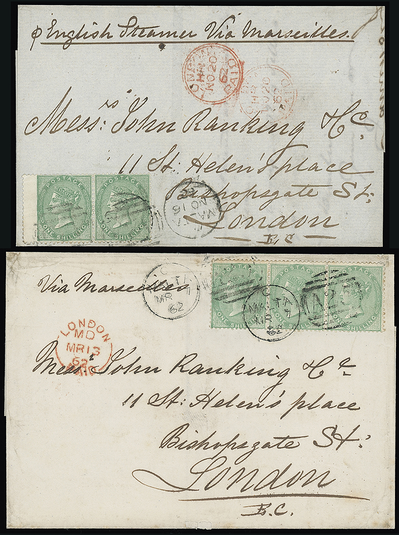 single arc c.d.s., the former carried by the French Packets “Capitole” to Messina and “Gange” to Marseille, very fine pair showing double and triple rates. Photo. (Image1)