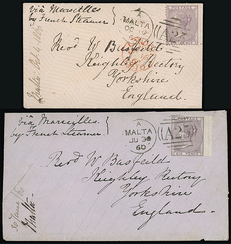 Malta: A25 Duplexes: Covers: 1860 (June 30 and Oct. 30) envelopes “via Marseilles/by French Steamer” to the same addressee in Yorkshire franked 1856 6d. tied by “A25” duplex, London transit and Keighley arrival