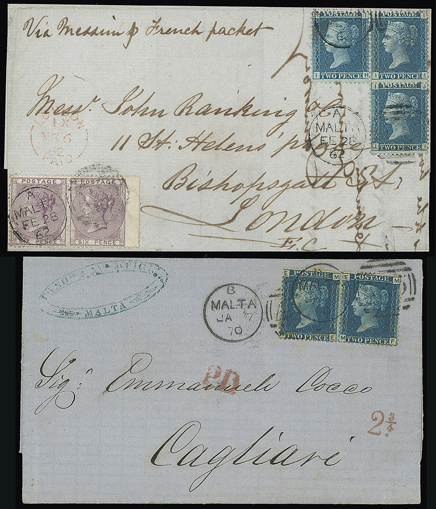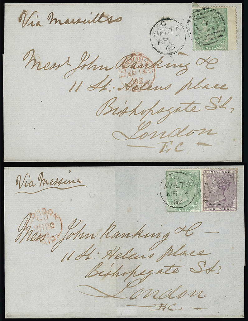 Malta: A25 Duplexes: Covers: 1862 (Mar. 14, Apr. 7) wrappers “via Messina” or “via Marseilles” to the same addressee in London franked 1856 1s. and 6d. or 1856 1s. tied by “A25” duplexes and with London Paid