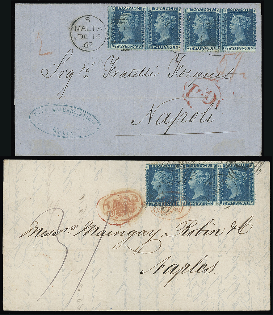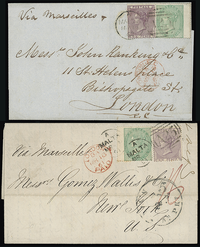Malta: A25 Duplexes: Covers: 1862 (Mar. 7, Nov. 20) wrappers to London both endorsed “via Marseilles” and franked 1856 1s. strip of three or wing margin pair tied by “A25” duplex with London Paid arc or double