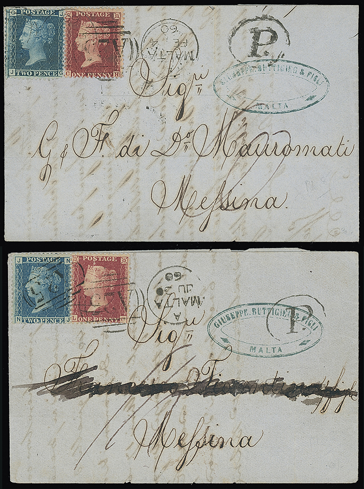 Malta: A25 Duplexes: Covers: 1860 (Feb. 4 and June 30) entire letters (latter with addressee’s name obliterated) to Messina each franked 1857 1d. and 1858 2d. plate 8 tied by “A25” duplex or “A25” barred oval and
