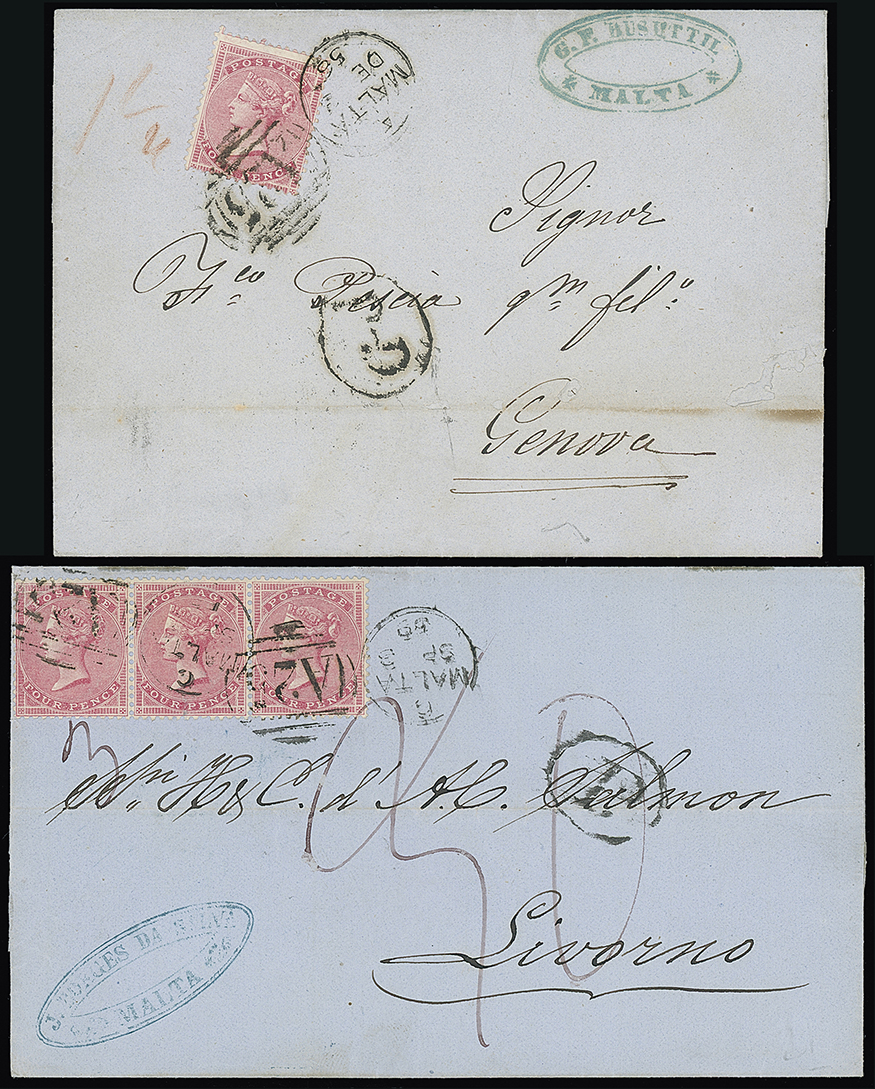Malta: A25 Duplexes: Covers: 1859 (Sept. 3) wrapper to Livorno franked 1857 4d. rose strip of three tied by “A25” duplexes with oval “P.” mark and rated “30” décimes and 1859 (Dec. 3) wrapper to Genoa franked 1857