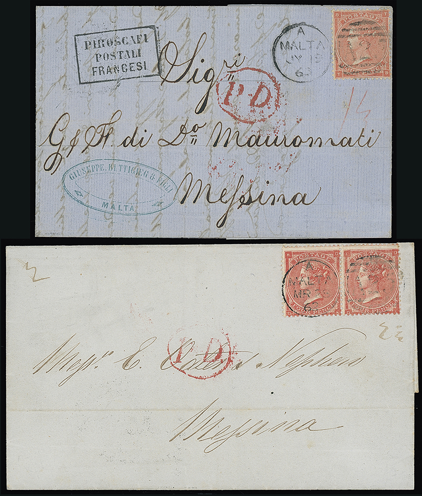 Malta: A25 Duplexes: Covers: 1862 (Mar. 28) entire letter to Messina franked 1862 4d. pair plate 3 tied by “A25” duplex with oval red “P-D.” mark and 1863 (July 19) entire letter to Messina franked 4d. plate 3